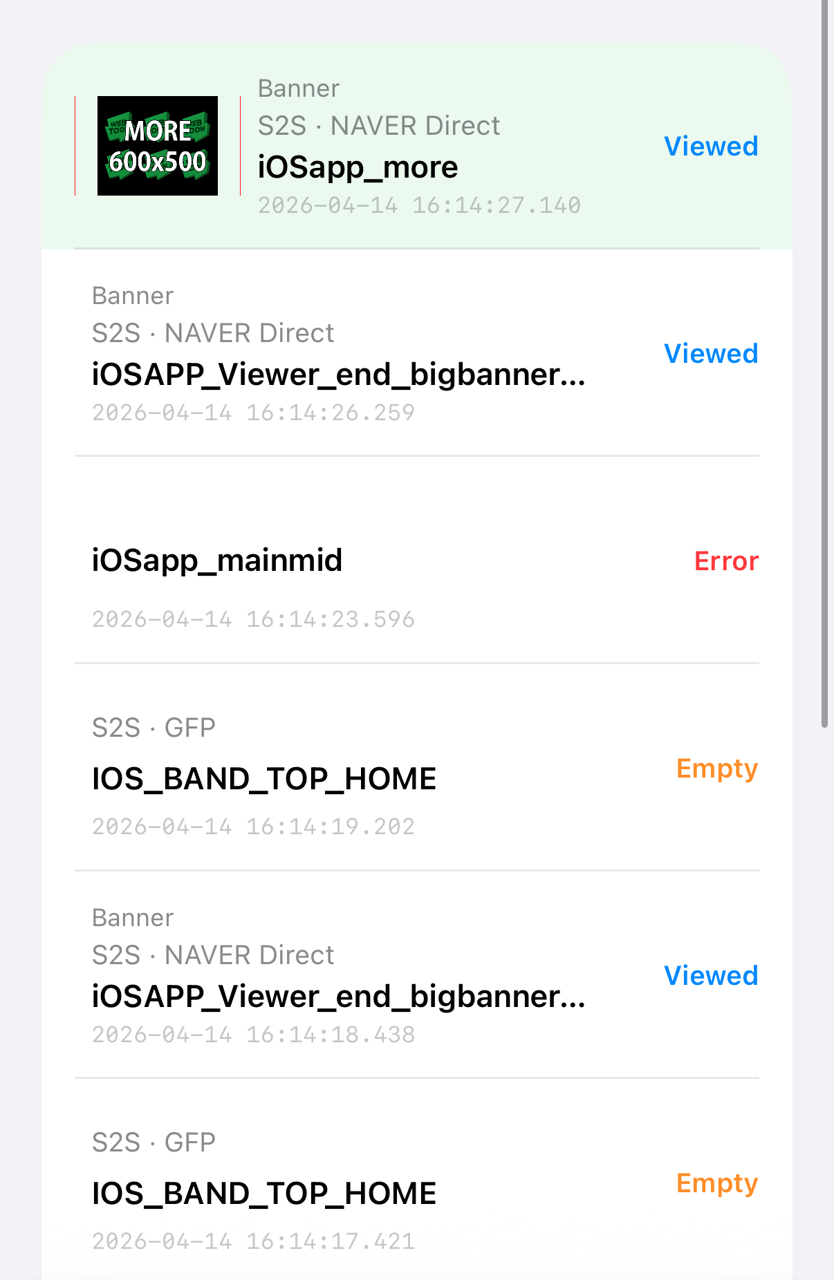 - Each ad log displays a status tag indicating its current state: