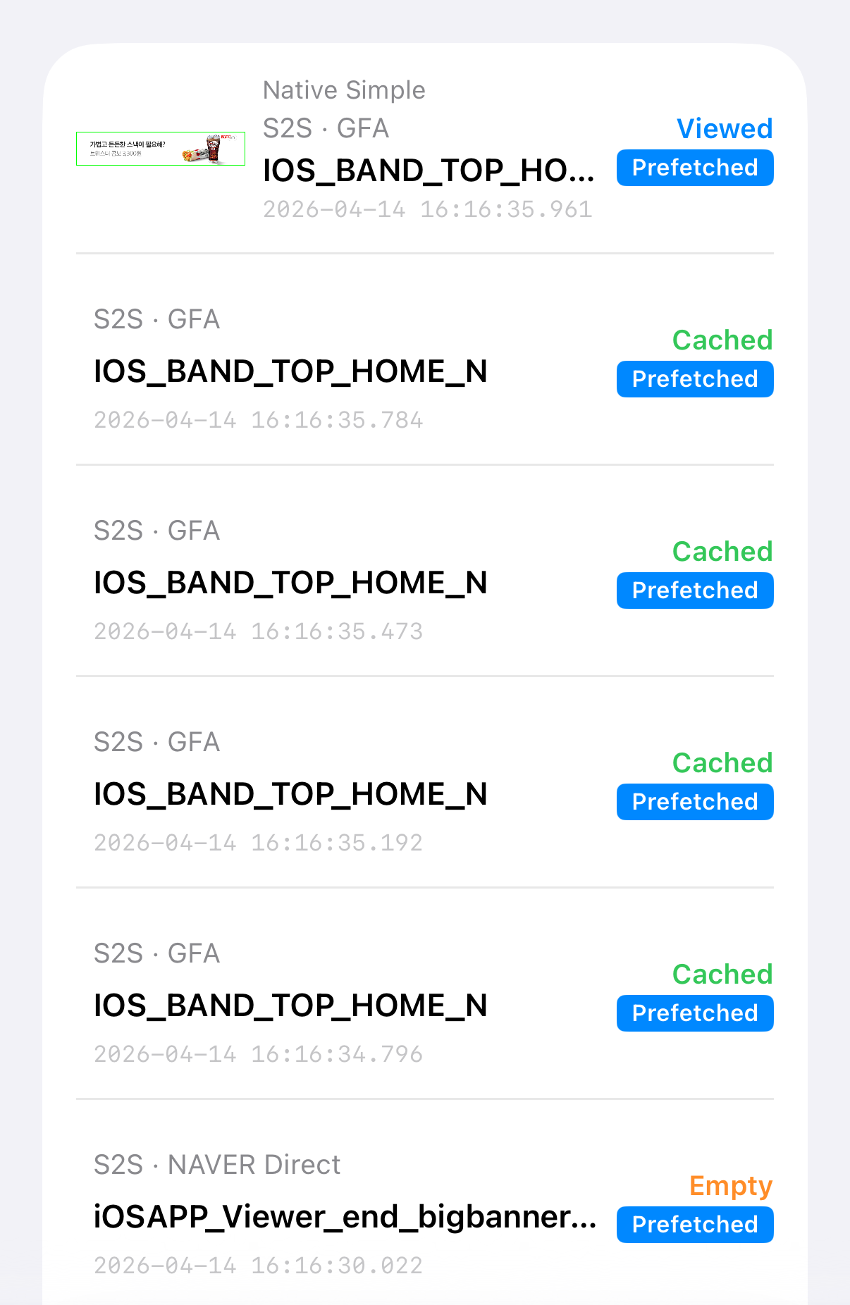 When ad caching is enabled, a Prefetched tag is displayed alongside the status.