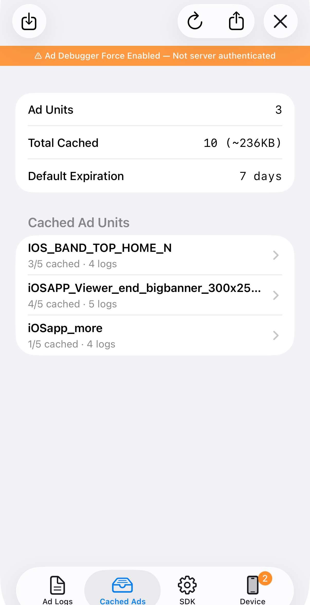 - Total Cached — Total number of cached ads and their combined storage size.