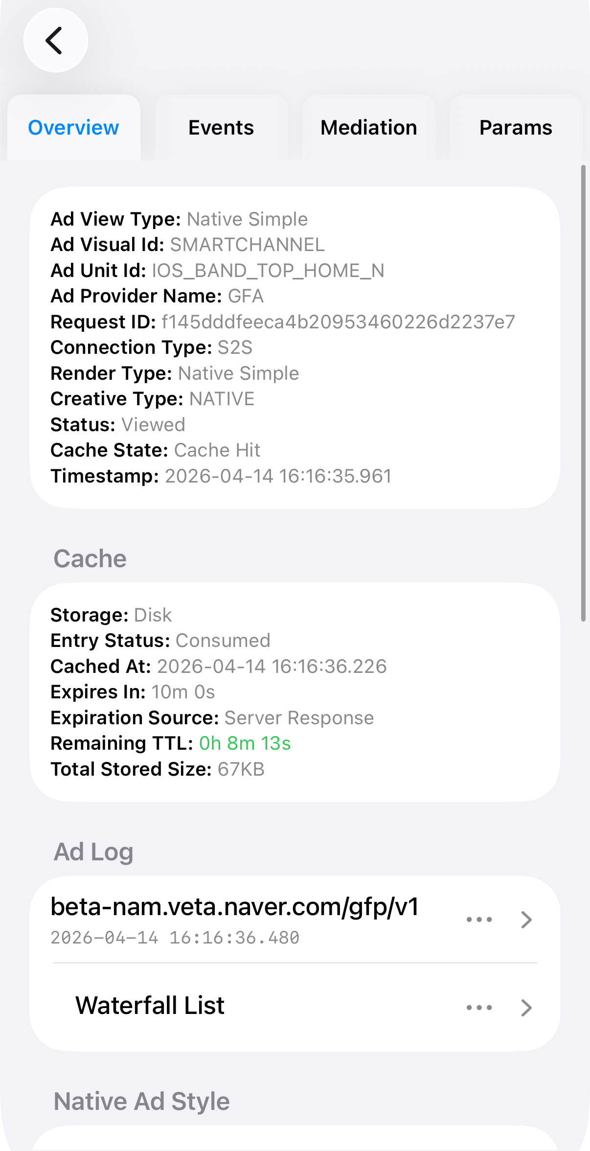 - Native Ad Style shows the style configuration returned for native ads.
