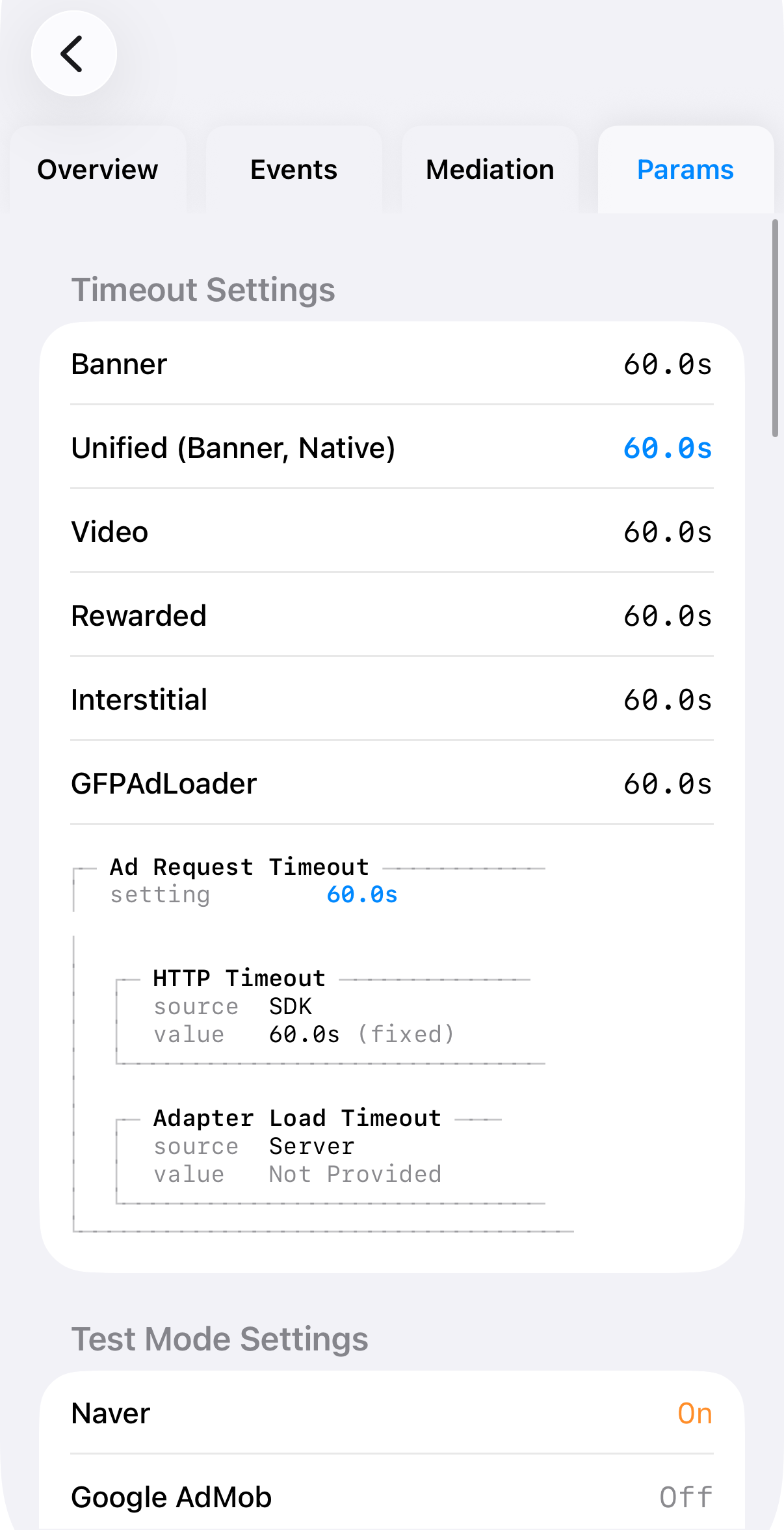 - Test Mode Settings shows whether test mode is enabled for each ad provider.