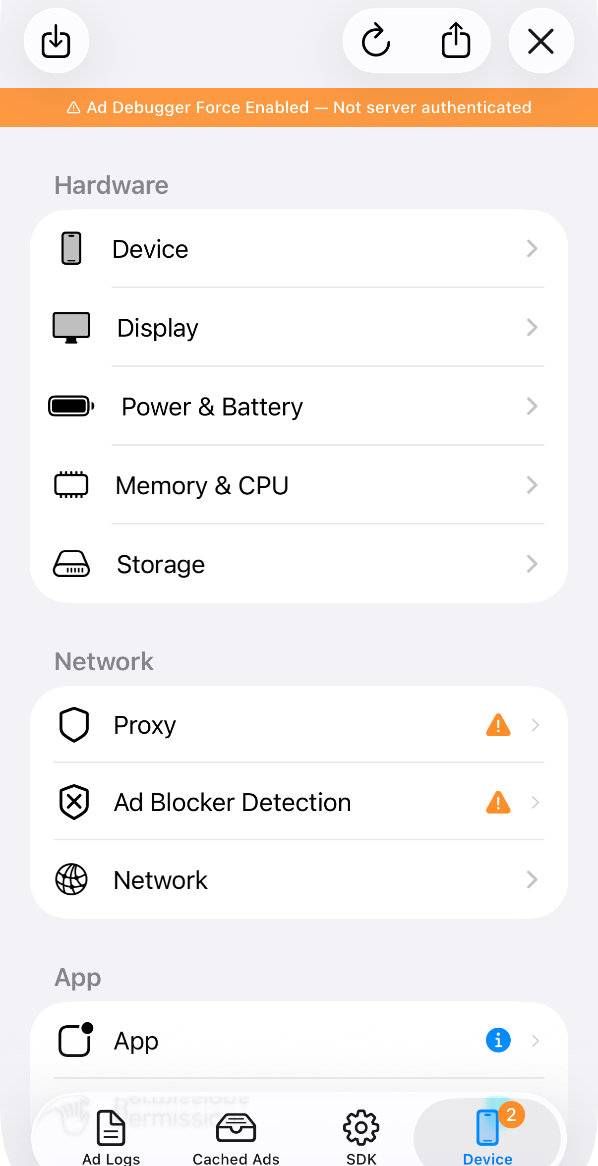 Tap the share button in the top-right corner to export the Ad Debugger data as a .zip file. You can attach this file when filing support requests.